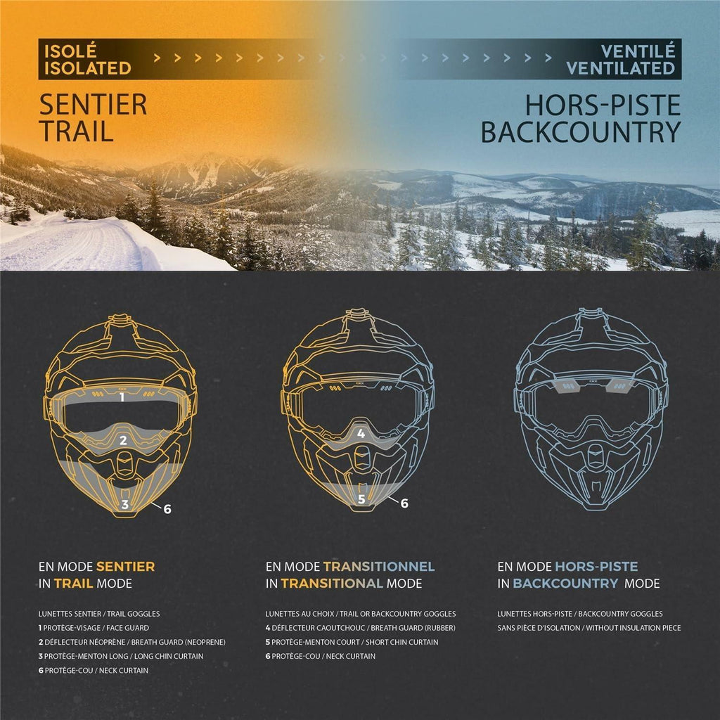 Shell: Titan Original Graphic: Solid Color: Carbon Size: 3XL Lens: No Shield Goggles: Included 210 Goggles Lens color: Clear Electric Double Lens Sunvisor Color: No Sunvisor Season: Winter Standards: ECE, DOT Attach system: Quick Release / Proclip Gender: Unisex, AdultEnjoy all of the iconic CKX Titan Original helmet features without risk of fogging with the 210 electric goggles. Using superior wire quality, these goggles are reliable and resistant, and offer the same exceptional field of vision that the Titan is famous for. The only fully configurable snowmobile helmet, the Titan Original can be adjusted to your level of activity and the weather conditions. For more sporty riding, you need only remove the insulation parts. You want to converse with your riding buddies or stop for a drink on the trail? No need to remove your helmet, just open the removable muzzle, a unique Titan feature. Get yourself connected with the Titan Original Electric Combo! Numerous patent applications are pending. Helmet features: Carbon fiber shell Weight: 1430 g +- 50 g (without goggles) 2 shell sizes (XS-L/XL-3XL) 4 EPS sizes 5 air vents Adjustable front vent Removable muzzle to free the lower face Height-adjustable peak Removable and washable liner and cheek pads ProClip quick release chin strap Exceeds ECE 22.06 & DOT FMVSS218 standard 210 goggle features: Insulated polyurethane flexible googles 210 frame Heated insulated double lens, Clear, UV protection, anti-scratch and anti-fog treatment Removable nose guard RapidClip strap Included: 2 removable breath guards: Neoprene for trail riding and rubber for backcountry Face guard 2 ...