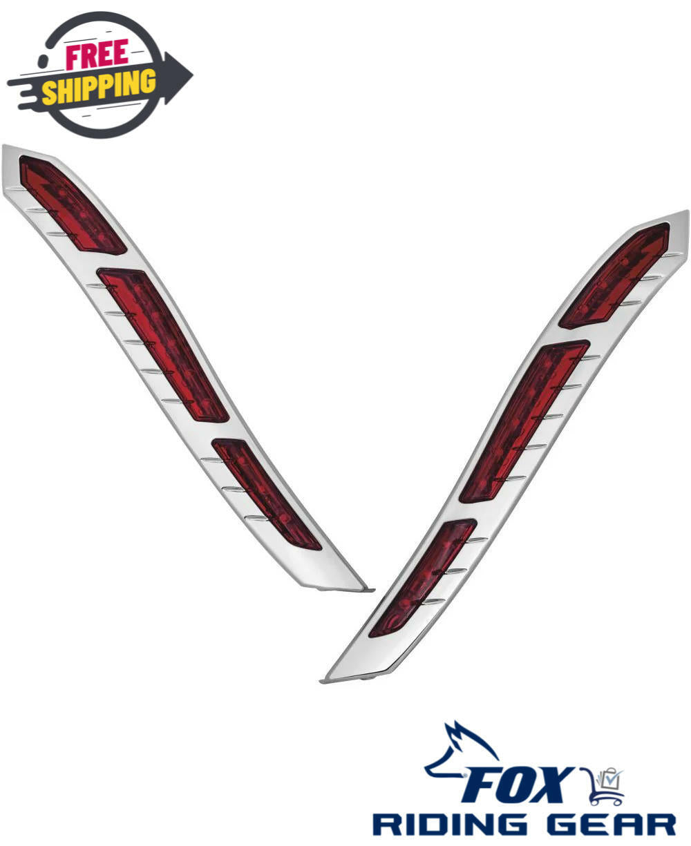 L.E.D. Rear Fender Strip Lights hug the rear fender lines for a classic appearance on Indian models with or without saddlebags. Factory-matched chrome housings feature subtle grooved accents and smooth contours that flow with the stock fender and trim. Three red lenses per accent coordinate with the stock taillight lens, and each contain multiple ultra-bright L.E.D.s that function as added brake and full-time running lights. Made from durable chrome-plated ABS with polycarbonate lenses, installation is hassle-free with plug-&-play wiring and high-strength 3M VHB application.